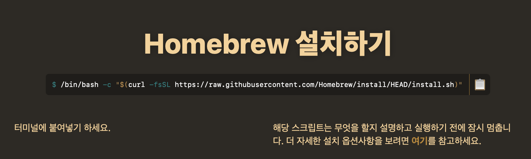 Homebrew 사이트 (https://brew.sh/ko/) 접속 후 설치하기의 스크립트 복사를 누르고 터미널에 붙여넣고 엔터를 치면 설치가 됩니다.