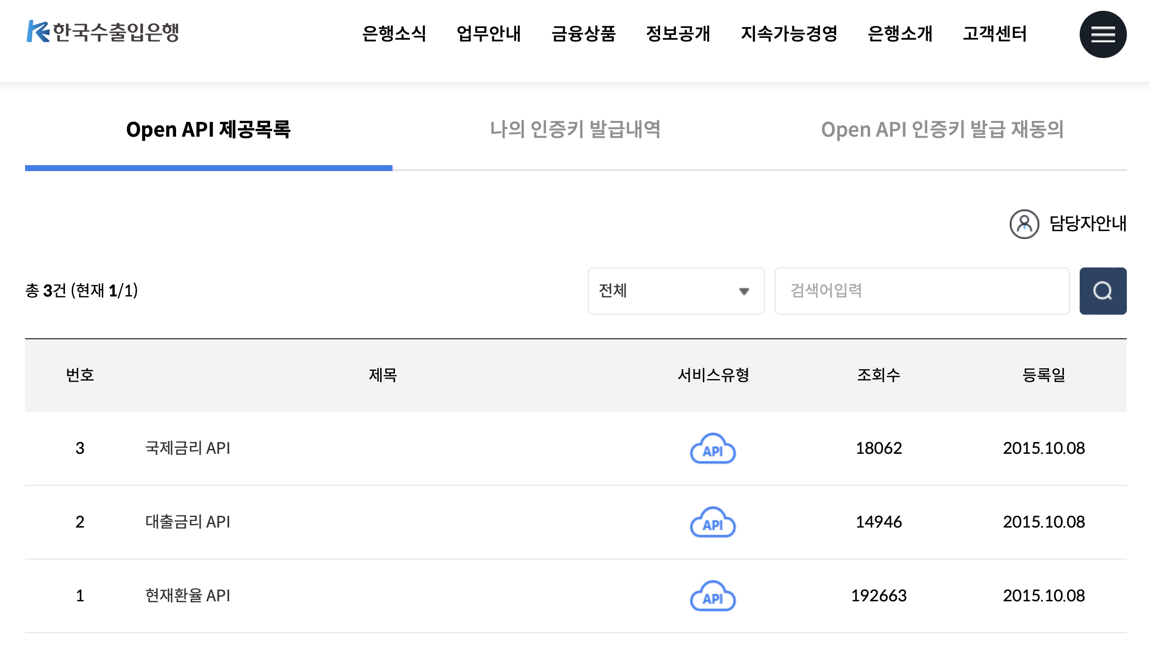 수출입은행 Open API 메뉴에 접속합니다. 3가지의 Open API 가 제공 됩니다.