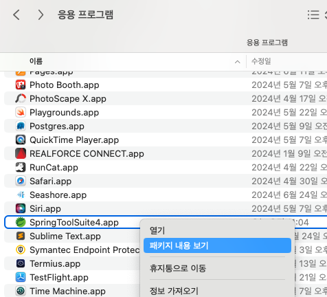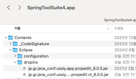 eclipse 혹은 sts 의 설치 폴더로 이동합니다. 전 mac 을 사용하니 아래처럼 폴더경로로 이동 합니다.