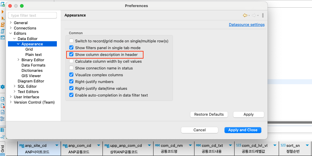 [Editors > Appearance > Show column description in header] 체크박스 체크