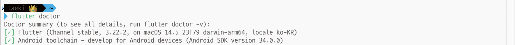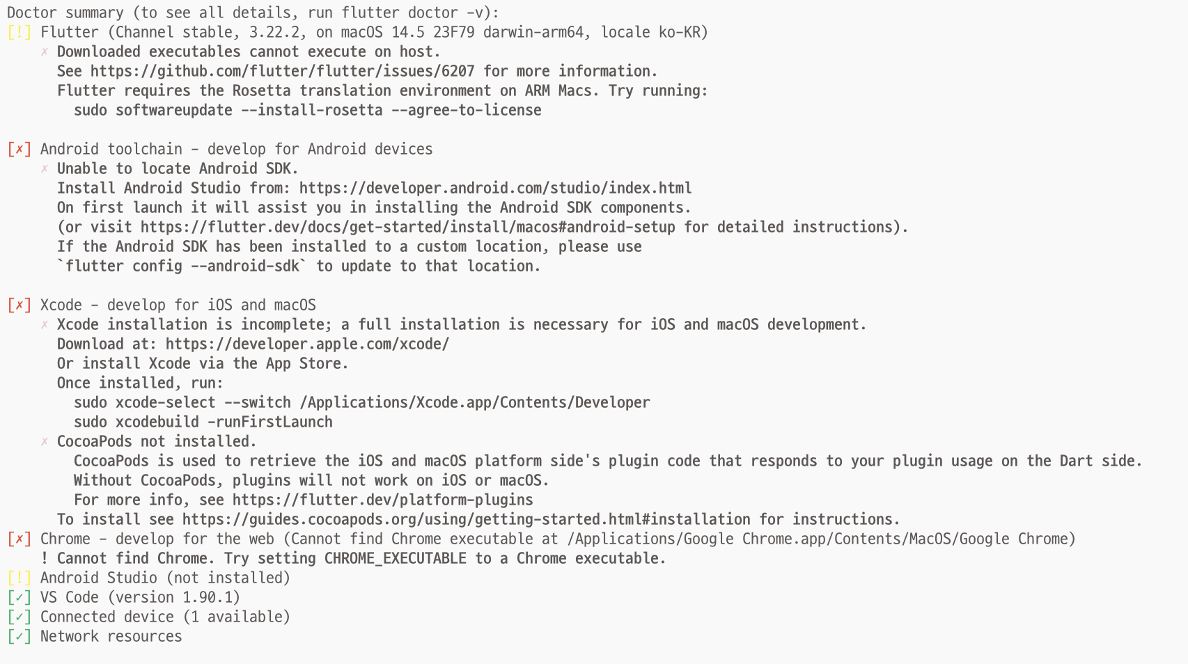 brew install --cask flutter설치를 완료하면 flutter 명령어 사용이 가능하고 플러터를 진짜 사용하기 위한 점검을 시작해야 합니다.