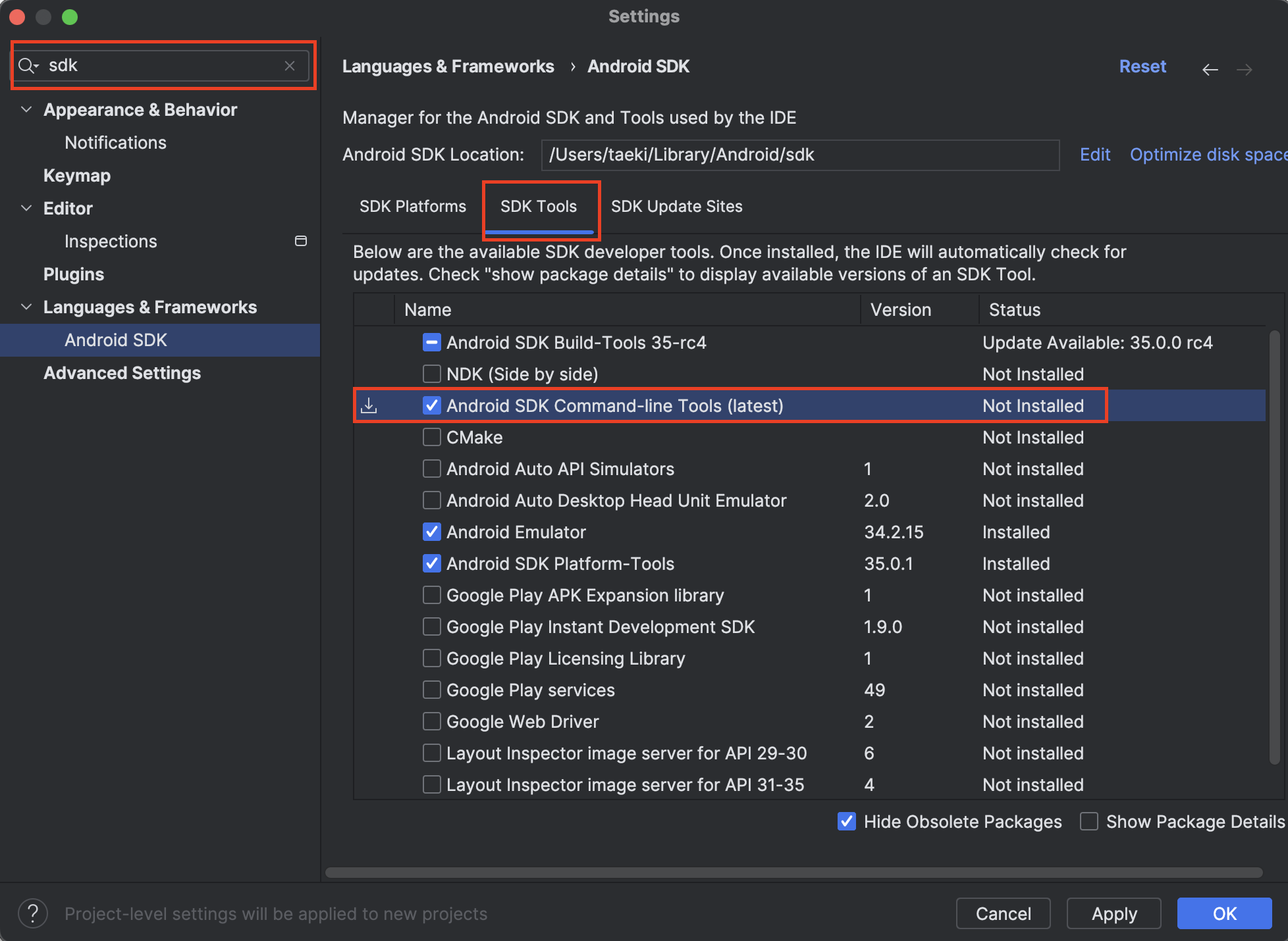 설치가 완료되면 [Settings..] 클릭해서 sdk 로 검색하고 android sdk 메뉴에서 sdk tools 탭으로 이동 후 android sdk command-line tools 를 체크하고 설치 합니다.
