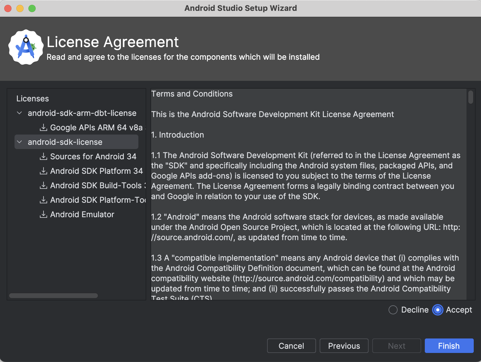 안드로이드 스튜디오를 다운받아 설치를 진행합니다. 설치 진행 시 라이센스는 모두 accept 후 진행하시면 됩니다.