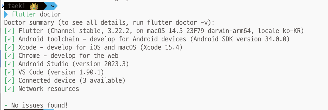 이제 모든 플러터 사용을 위한 이슈사항을 해결했습니다. 플러터 코딩 시작하시면 됩니다.