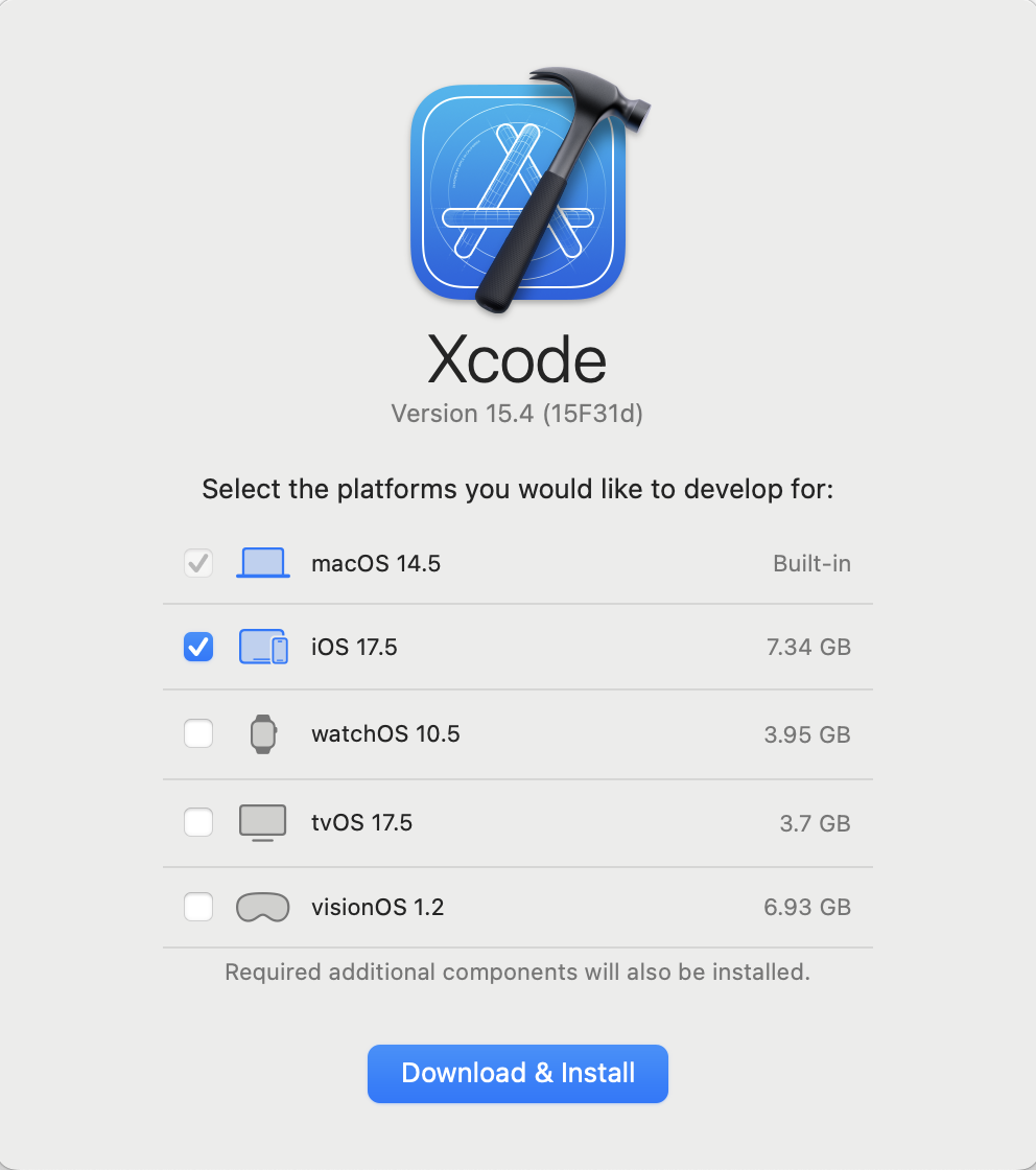이번엔 IOS 시뮬레이터를 사용하기 위한 xcode 설치 및 실행 입니다. 앱스토에서 xcode 다운을 받을 수 있습니다. 설치를 하면 xcode 를 실행해 주세요. 원하는 플랫폼을 모두 체크해 주세요. 전 일단 IOS 만 체크하겠습니다.