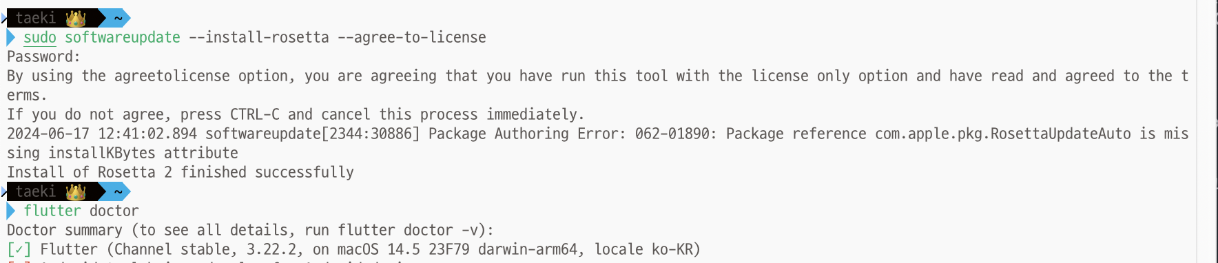 터미널창에 실행하면 로제타2 설치가 성공했다고 합니다. 다시 flutter doctor 를 실행하면 해결된걸 확인 할 수 있습니다.