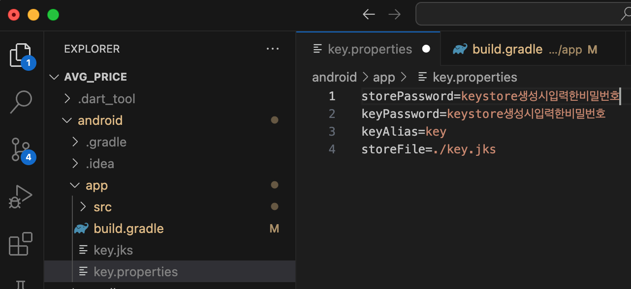 프로젝트폴더 내 [android > app] 폴더에 key.properties 파일을 생성하고 아래 내용을 작성해 줍니다.