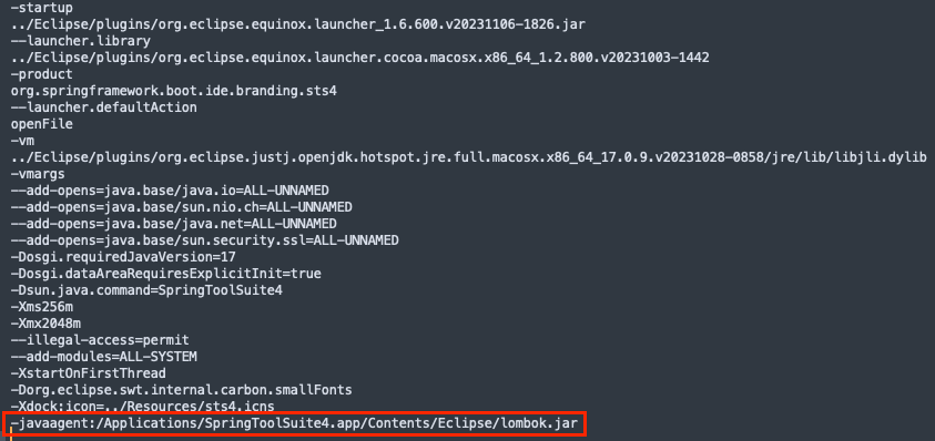 -javaagent:/Application/SpringToolSuite4.app/Contents/Eclipse/lombok.jar