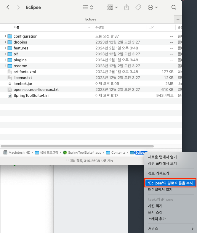 먼저 Finder 응용프로그램에서 SpringToolSuite4.app 우클릭으로 패키지 내용 보기를 클릭 합니다.